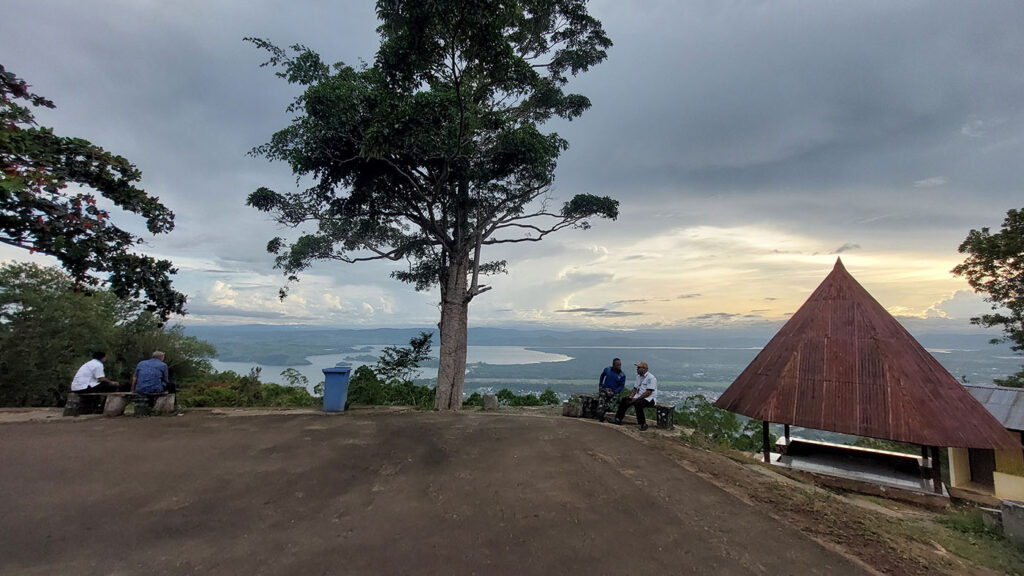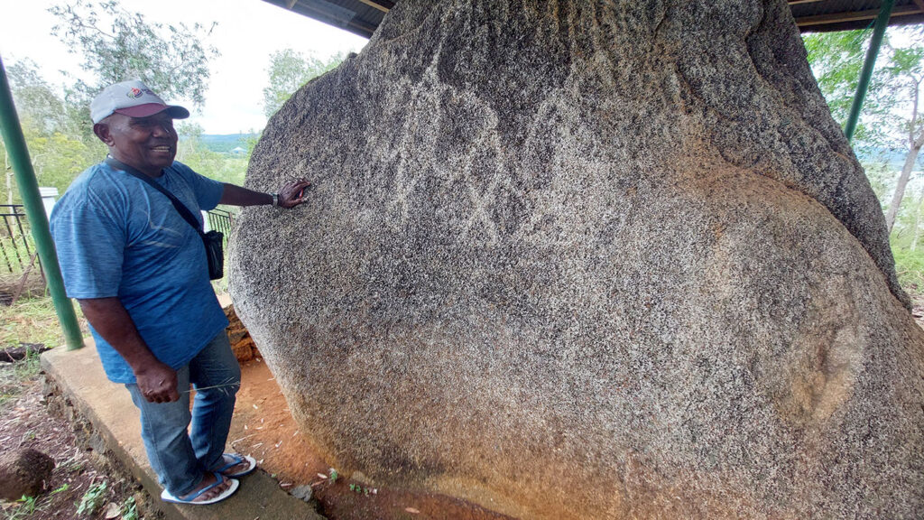 Kunjungan pertama ke Situs Megalitikum Tutari di Kampung Doyo Lama – Distrik Waibu, sekitar 15 menit dari kantor Pemda. Situs ini merupakan situs purbakala utama di tepi Danau Sentani, tempat ratusan menhir dan batu-batu bergambar (petroglif) yang menggambarkan hewan seperti ikan, kura-kura, dan kadal yang berkaitan dengan kehidupan danau. Situs ini diyakini sebagai peninggalan suku kuno (Suku Tutari), yang konon berfungsi sebagai tempat pemujaan dan penghormatan leluhur. Batu-batu utama tersebar di beberapa puncak bukit, yang dapat diakses dengan tangga beton dengan naungan pohon ekaliptus. Menurut saya, lansekap utamanya justru pemandangan sepotong bagian Danau Sentani yang terlihat cantik dari ketinggian 50-200 mdpl. Banyak hal yang sebenarnya masih menjadi pertanyaan di benak saya. Dari mana asal batu-batu besar ini? Saya yakin bukan dari Gunung Cycloop, karena Pegunungan Cycloop (atau Dafonsoro) merupakangugusan pegunungan non-vulkanik.