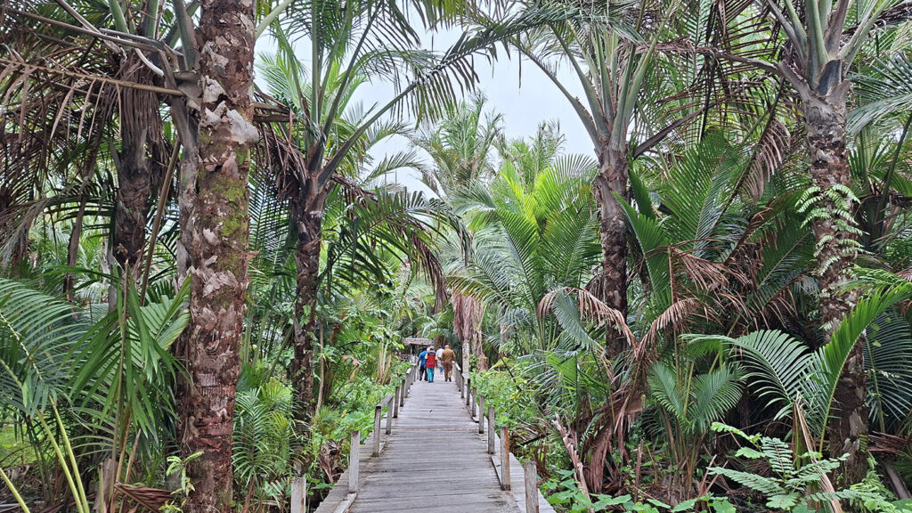 Setelah 20 menit menyeberang dengan menggunakan perahu tradisional, Kampung Yoboi cukup menarik untuk dijelajahi. Kampung Yoboi sendiri adalah desa wisata unik yang mayoritas bangunannya terapung di atas Danau Sentani, termasuk lapangan volinya. Tapi sebenarnya, saya tertarik dengan hutan sagu yang ada di kampung ini, yang konon merupakan hutan sagu terluas di Jayapura. Saya menghabiskan waktu untuk berjalan menyusuri jembatan kayu sepanjang 420 meter menembus hutan sagu. Sayangnya, beberapa bagian dari jembatan dan shelter sudah rusak dan kondisinya kurang terawat. Tapi melihat pohon-pohon sagu dengan ukuran raksasa yang daun-daunnya menjuntai membetuk kanopi, membuat sore menjadi asik untuk dinikmati.